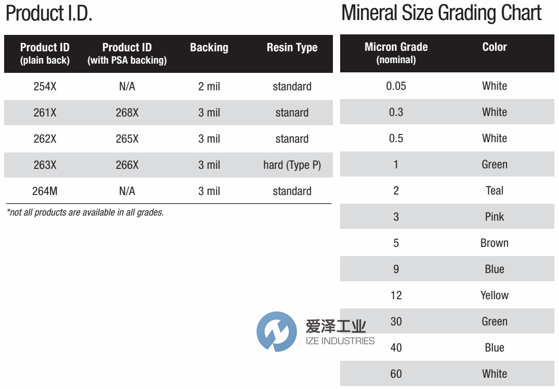 紧密分级的氧化铝矿物浆料涂在聚酯薄膜背衬上。可使用或不使用 PSA(压敏粘合剂)。