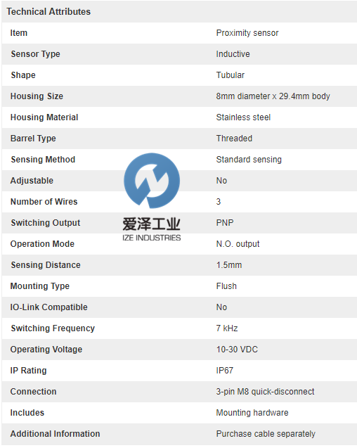 电感式接近传感器,管状,直径8mm x 29.4mm,不锈钢外壳,PNP,NO输出,1.5mm感应距离,齐平,开关频率7 kHz,IP67,3针M8快速断开。