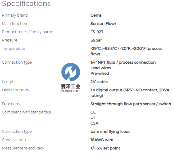 直通流道传感器/开关-Gems(FS-927)-额定69bar/1000psiG-额定-29°C…+93.3°C/-20°F…+200°F(工艺流程)-1/4“NPT流体/工艺连接-导线电气连接-带裸端飞线的预接线(24”长)-1 x数字输出(SPST-无触点);20VA额定值)-活塞测量
