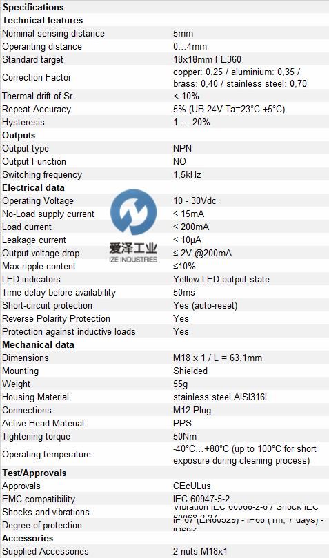 MICRO DETECTORS感应传感器PD1/CP-1F产品参数
