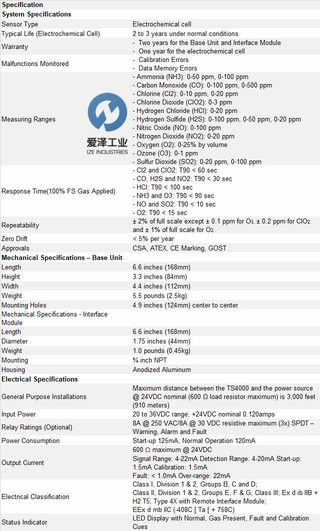 TS4000是+ 24VDC供电的有毒气体检测仪,由基本单元,接口模块和电化学电池(传感器)组成–有关更多信息,请分别参见第2.4、2.5和2.6节。 TS4000支持各种通用监控器认可的电化学电池,只需更换和校准传感器即可用作通用有毒气体检测器。接口模块的基于微处理器的电子设备在传感器处处理信息,并将检测到的气体值传送到基本单元以进行数据控制和显示。