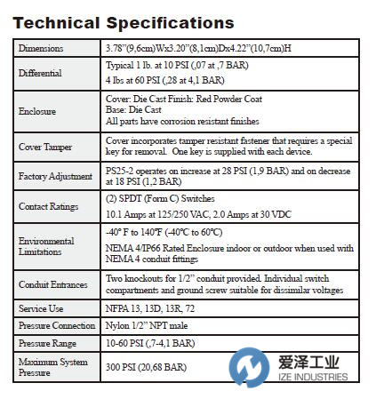 POTTER PS25系列监控压力致动开关主要用于检测自动消防洒水系统中正常系统压力的增加和/或减少。典型应用包括:干管和预作用系统中的空气/氮气监控,压力罐,空气供应和水供应。PS25-2有两个开关。低压开关出厂设置为在压力降低时以约18 psi(1,2 BAR)的速度激活。高压力开关出厂设置为在压力升高时以约28 psi(1.9 BAR)的速度激活。NFPA 72需要高压和低压条件下的监控信号。PS25出厂设置为23 psi的正常气压。POTTER 防爆压力开关其他型号: