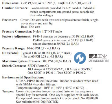 POTTER PS40系列监控压力致动开关主要用于检测自动消防洒水系统中正常系统压力的增加和/或减少。典型应用包括:干管系统,预作用空气/氮气监控,压力罐,空气供应和水供应。PS40开关出厂设置为正常系统压力为40 PSI(2.8 BAR)。标有LOW字样的开关设置为在30 PSI(2.1 BAR)的压力下降10 PSI(0.7 BAR)时运行。标有“ HIGH”字样的开关设置为在50 PSI(3.5 BAR)的压力增加10 PSI(0.7 BAR)时运行。POTTER 防爆压力开关其他型号: