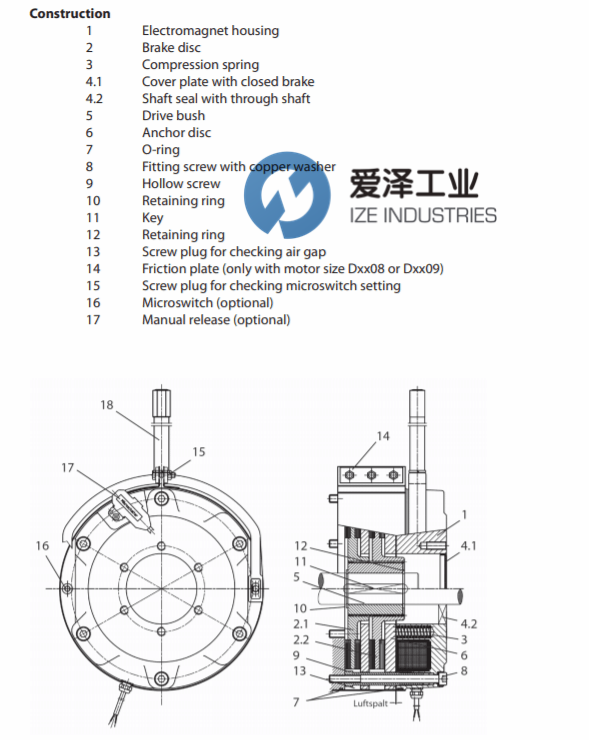 当在磁体外壳(位置i)中的线圈上施加直流电压时,会产生磁力,从而将压力板(位置6)克服弹力拉向磁体外壳(位置1)。制动盘(位置2.1和2.2)可以自由运行并打开制动器。