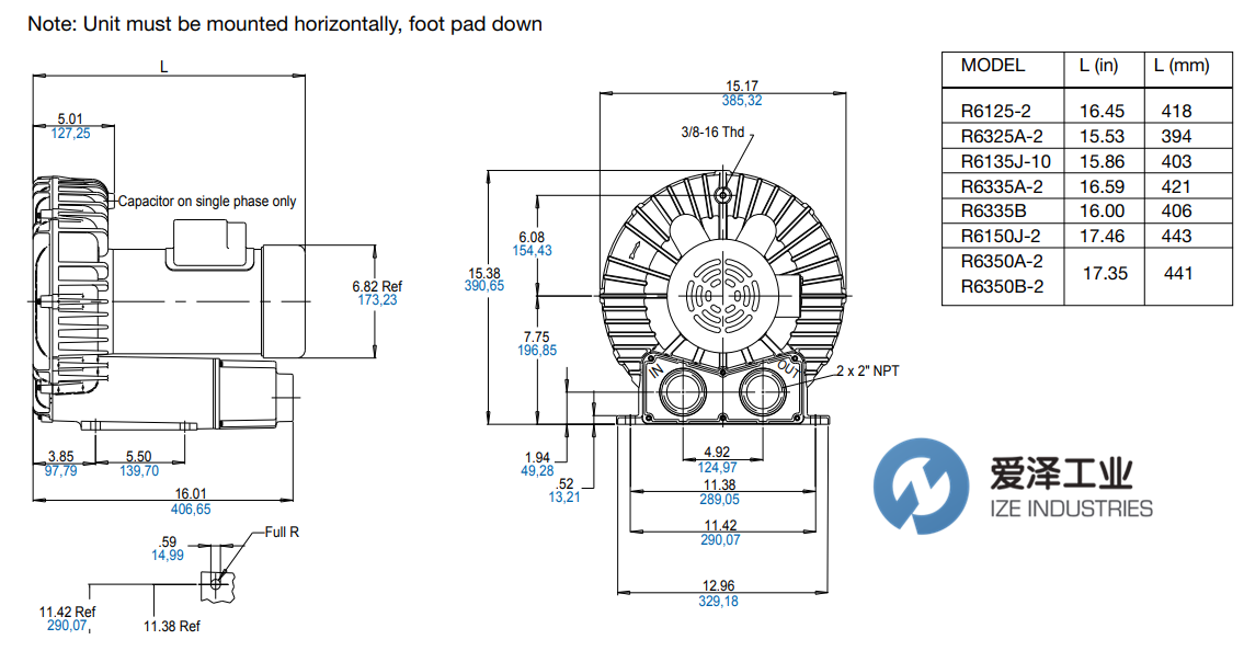 • UL and CSA approved TEFC motors with permanently sealed ball bearings (R6150J-2 and R6135J-10 has ODP motor)