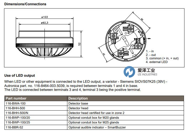 AUTRONICA烟气探测头116-BHH-500技术参数