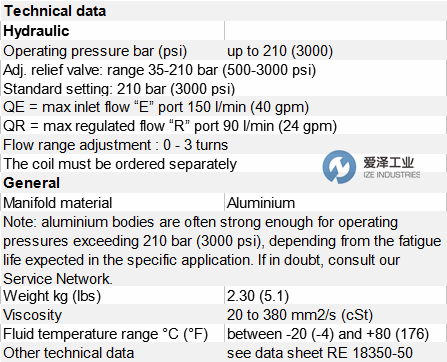 从E到R建立了恒定的压力补偿流量,而*小压力差约为。两个端口之间存在5 bar(70 psi)的压力。供应给E的输入流量超过R处的调节输出,将被旁路到T。调节流量可以从关闭到阀的标称*大额定值变化,并且其压力由溢流阀控制,该溢流阀将排放到Tank上。如果达到*大压力,则输出流量。断电时,常开螺线管盒会将所有入口流量旁路到油箱。从R到E的逆流受节流阀的选定开度限制,并且没有压力补偿。不允许从T到R的流量。