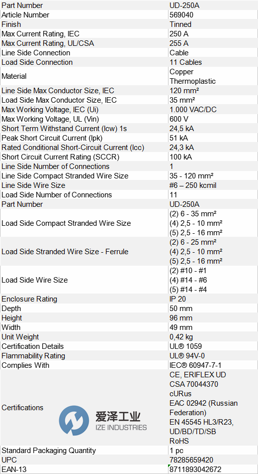ERICO配电块UD-250A系列其他常用型号: