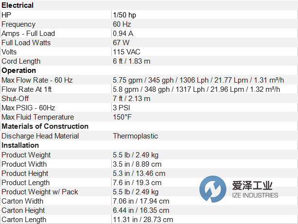 LITTLE GIANT磁性驱动泵581030 3X.MDX技术规格