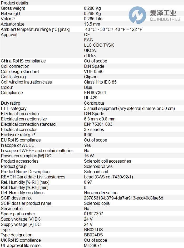 DANFOSS电磁阀线圈BB024DS 018F7397技术参数及介绍