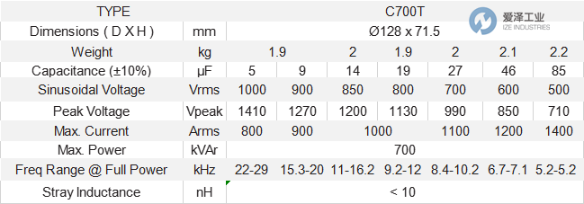 该电容器可提供高达 1000Vrms 的电压和高达 1400Arms 的电流。