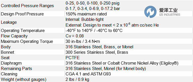 TESCOM 44-2300系列是一款紧凑、轻便的单级背压调节器,适用于低于4 SCFM / 113 SLPM的特种、易燃和工业气体流量。防扩散金属隔膜密封确保气体纯度和完整性。