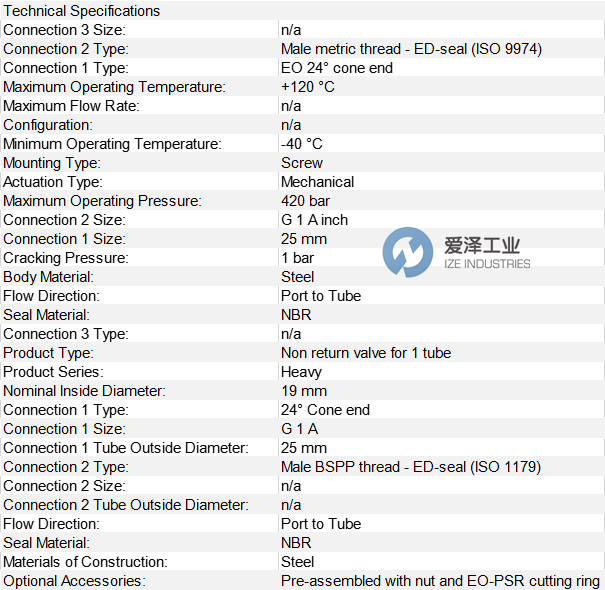 止回阀可根据需求提供钢、不锈钢和黄铜材质。密封件可选用 NBR 或 FKM,根据要求提供。