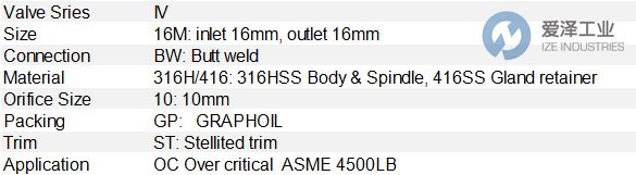 SAFELOK针阀IV16MBW316H/416-10-GP-ST-OC技术参数