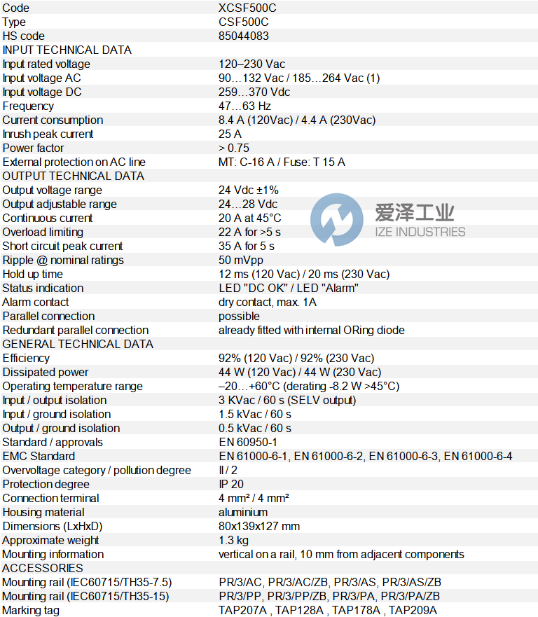 CSF500C 单相电源输入 120-230Vac / 输出 24Vdc 20A