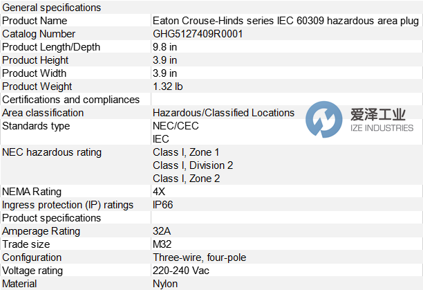 Crouse-Hinds系列CEAG GHG51 IEC 60309插销与插套设备是具备*新技术创新的全球产品线,引领IEC 60309性能的潮流。经过认证,适用于Class I, Division 2和Class I, Zone 1 & 2的危险区域。每一个Crouse-Hinds系列IEC 60309插头和插座都经过精心设计,以在要求严苛的潮湿环境中,尤其是需要强力冲洗的场所中提供可靠性、效率和额外的安全保护。