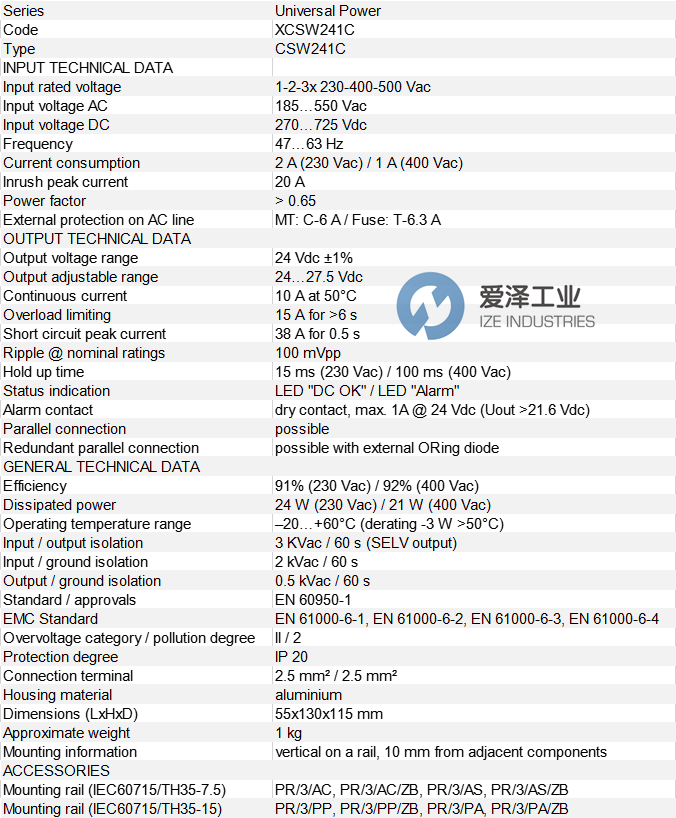 输入电源: 1-2相电源输入,电压为230-400-500Vac,输出为24Vdc,10A。