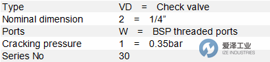 • VD*-W* 阀门为带“BSP”螺纹接口的单向阀,可直列安装在液压管路上。