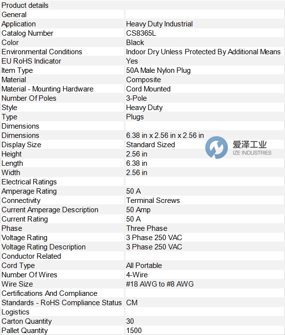 HUBBELL插头CS8365L技术参数及介绍