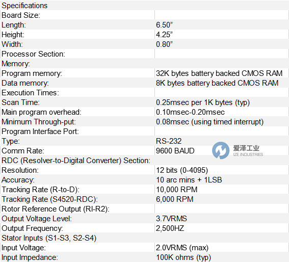S4520-RDC 是一个智能I/O板(COCPU),主要设计用于运动控制应用。S4520-RDC 专为伺服运动控制而设计,可用于单轴或多轴控制应用中实现伺服轴(在多轴控制应用中,会使用多个 S4520,每个轴使用一个)。该板从其安装的 M4510 或 M4512 的背板直接获取主要的参考位置,与无刷伺服放大器接口,驱动伺服电机,并通过伺服电机的解析反馈监测实际的伺服位置。用户可以编写应用程序来执行 PID 算法以“闭合”控制回路,使伺服轴能够准确地跟踪主参考位置。请注意,S4520-RDC 设计用于与配备解析器进行位置反馈的伺服电机接口,而非编码器。对于配备编码器进行反馈的伺服电机应用,请参阅 S4520-ENC 数据表。